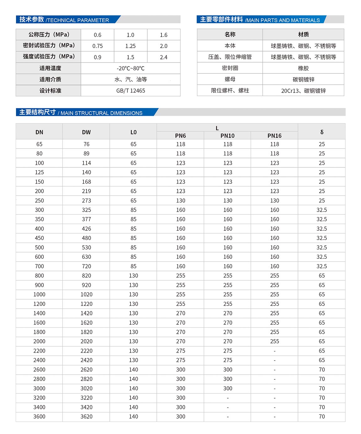 松套限位補償接頭安裝在管道上后,擰緊螺母,起到密封和連接作用。當(dāng)溫度變化時,管子能在接頭中間自由地伸縮,當(dāng)?shù)鼗鲁?、偏斜,它均能確保密封無滲漏,從而達到自動補償之目的。