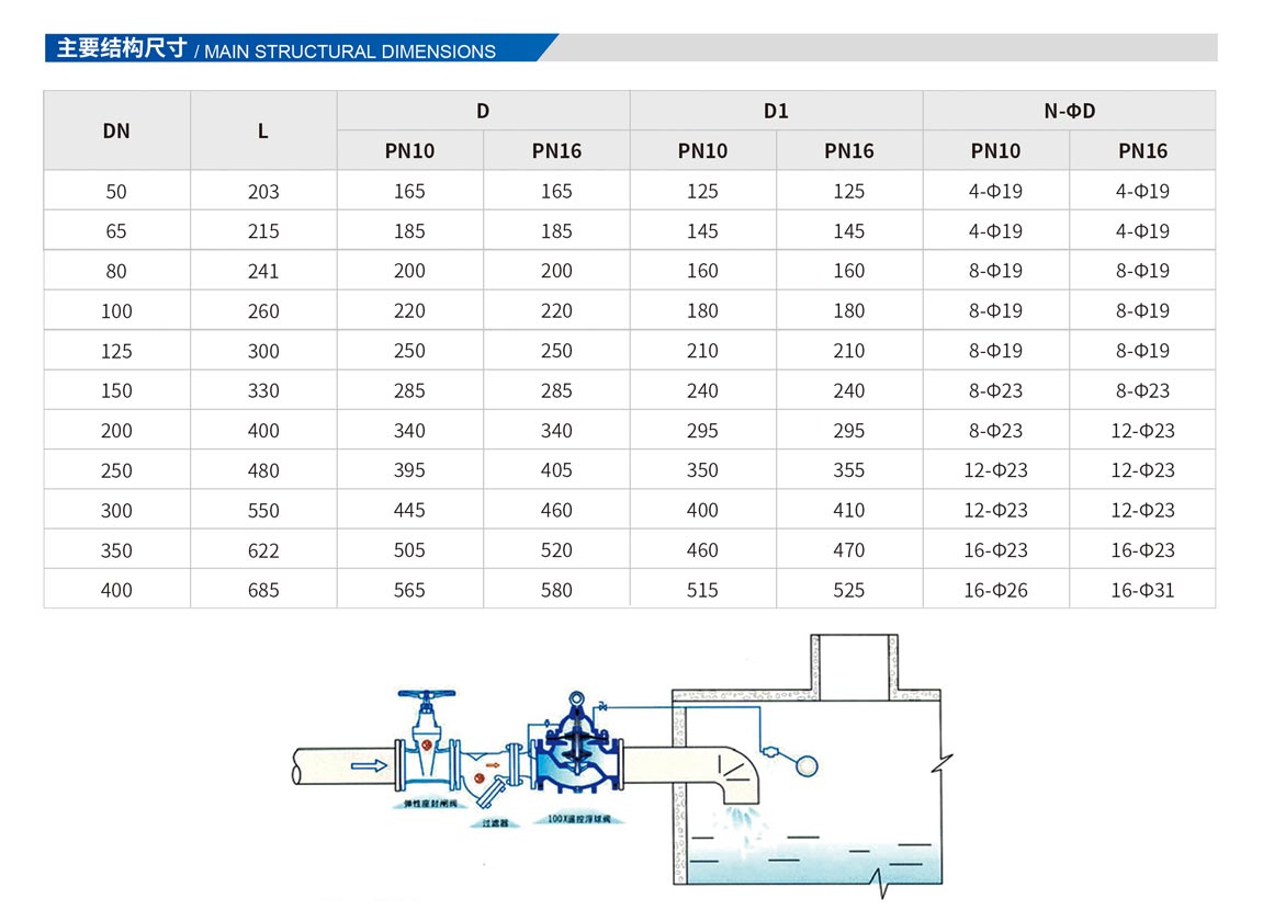 該閥門能有效地控制水塔或水箱液面,適時切斷或打開閥芯輸入水充或阻止水流外泄。液位控制準(zhǔn),水位不受壓力波動干擾,開團(tuán)緊密不漏水,浮球靈活,維護(hù)保養(yǎng)簡單(控制球閥可與主閥分離安裝),適用于工礦,企業(yè),高層建筑中的水箱,水池,水塔的自動供水系統(tǒng)。